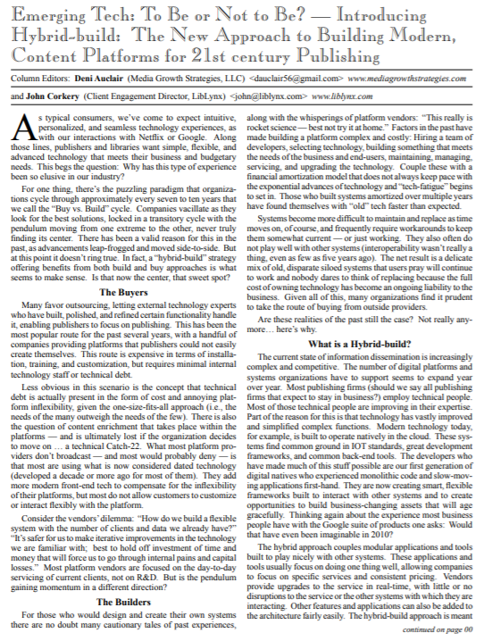 The feature, ‘Emerging Tech: To Be or Not to Be? — Introducing Hybrid-build: The New Approach to Building Modern, Content Platforms for 21st century Publishing’, was published by Against the Grain.