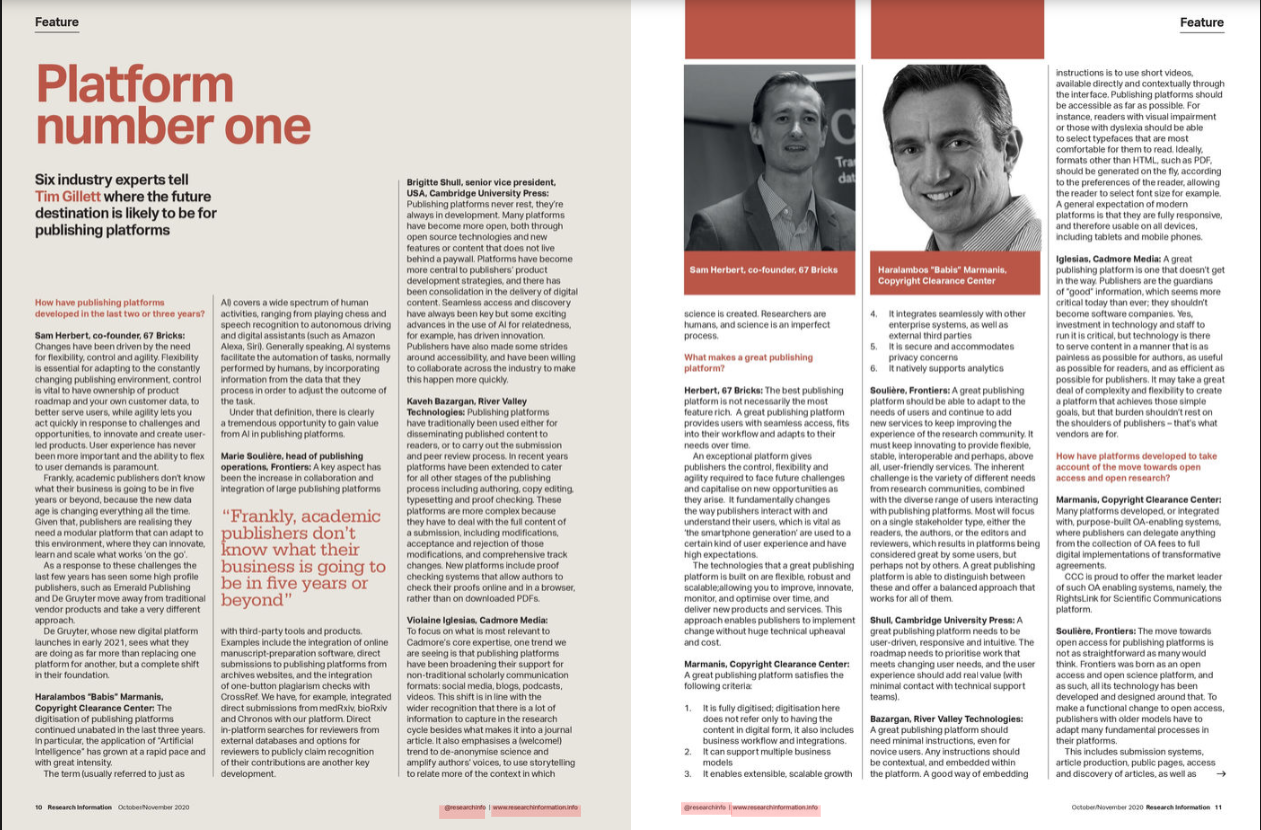 67 Bricks’ co-founder Sam Herbert is one of six industry experts interviewed by Research Information editor Tim Gillett this month. Tim’s feature in the October/November issue of the magazine takes an in-depth look at how publishing platforms have developed during the last few years, and asks what the hallmarks of a great platform are, and how they might evolve further. As publishing adapts to the new digital era where format choice, speed and access to material is just as critical as the content itself, this couldn’t be more timely.